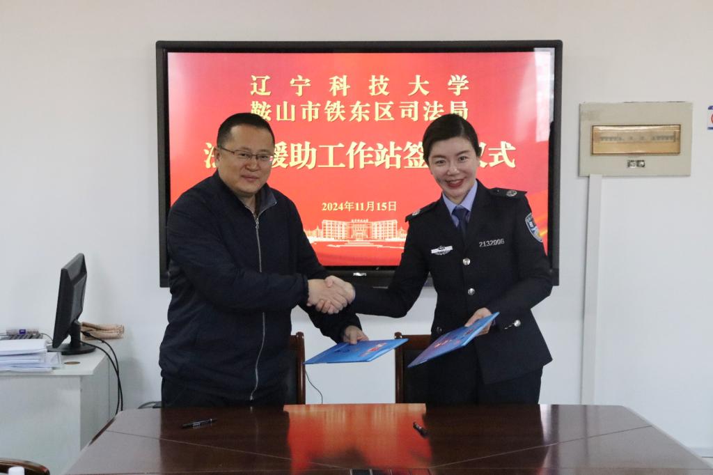 11月15日,遼科大經法學院與鞍山市鐵東區司法局舉行“法律援助工作站”簽約儀式。本次簽約儀式由經法學院副院長邵玲主持,鐵東區司法局局長肖冰等一行6人、經法學院主要領導、教師代表及部分法學專業學生代表參加了簽約儀式。