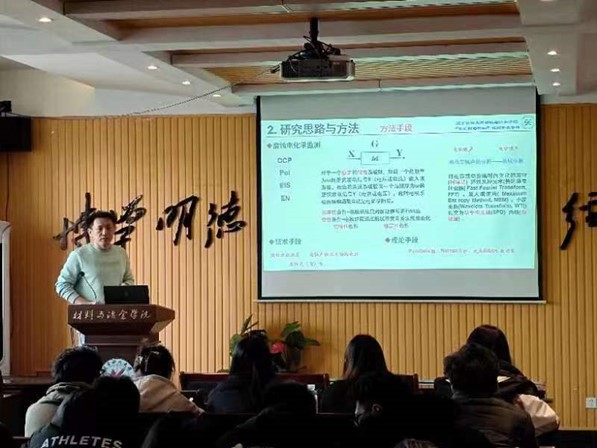 陳東旭副教授報告主題為“局部水化學(xué)演變對金屬及改性層腐蝕行為影響機(jī)制”。鈍態(tài)金屬往往容易在含Cl-環(huán)境中發(fā)生局部腐蝕損傷,進(jìn)而大大影響材料服役壽命,帶來嚴(yán)重的安全隱患和經(jīng)濟(jì)損失。陳老師針對不銹鋼及鋁合金等常見耐蝕金屬的局部腐蝕問題,提出了局部水化學(xué)環(huán)境演變是影響金屬及其表面改性層耐蝕耐久性能的關(guān)鍵。