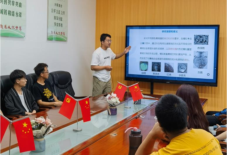 梁智鵬老師做了“青銅器類文物的腐蝕行為及產物調控研究”報告。陜西周原遺址是西周文化的重要發祥地,周原遺址出土的墓葬和窖藏的青銅器具有重要的學術價值,但無論是青銅器的現場發掘還是后續的保存都面臨著嚴峻的腐蝕防護問題。報告人以仿制西周時期出土的青銅合金為研究對象,通過電化學測試手段以及先進的組織形貌表征技術,研究了不同組分和含量的青銅類合金在該腐蝕環境下的腐蝕行為。揭示了青銅類合金在周原遺址考古土壤腐蝕環境下的腐蝕形貌演變和電化學腐蝕行為,通過改變合金成分的方式實現對青銅合金表面形成銅銹的成分和顏色的調控,以便為日后該地區青銅器文物的現場挖掘和保護提供依據,為青銅器類文物的防腐保存和修復重塑提供參考。