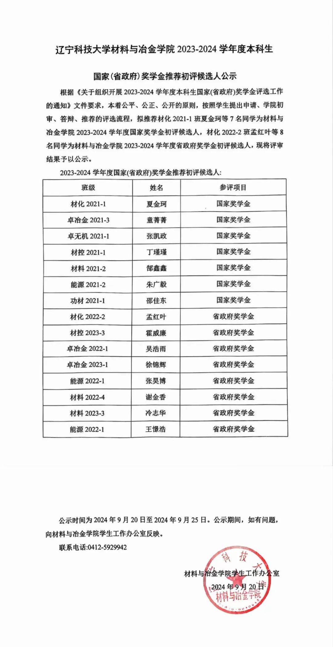 材料與冶金學院2023-2024學年度本科生 國家(省政府)獎學金推薦初評候選人公示