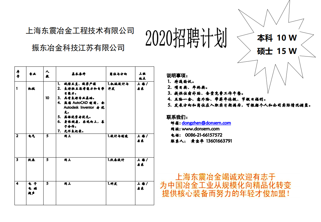 上海東震冶金工程技術有限公司招聘計劃