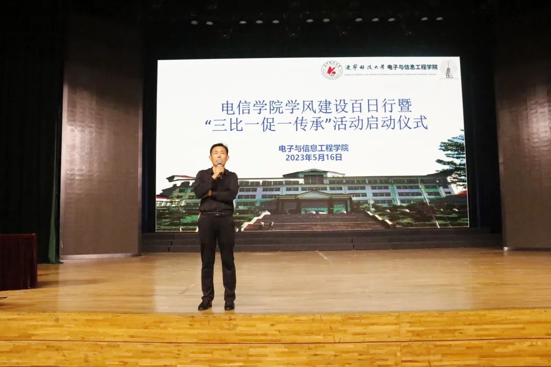 為深入學習貫徹習近平新時代中國特色社會主義思想,落實《遼寧科技大學進一步加強內涵建設 服務遼寧全面振興新突破三年行動方案》要求,加強學風建設和文化建設,營造良好的育人環境,5月16日,電信學院于校禮堂舉行學風建設百日行暨“三比一促一傳承”活動啟動儀式,此次活動由電信學院黨委書記王會立主持,電信學院21、22級全體學生參加。