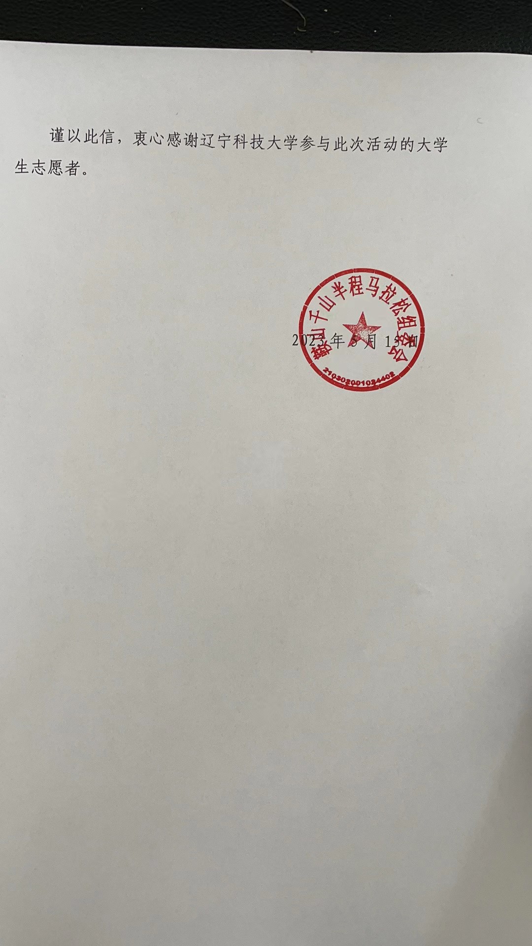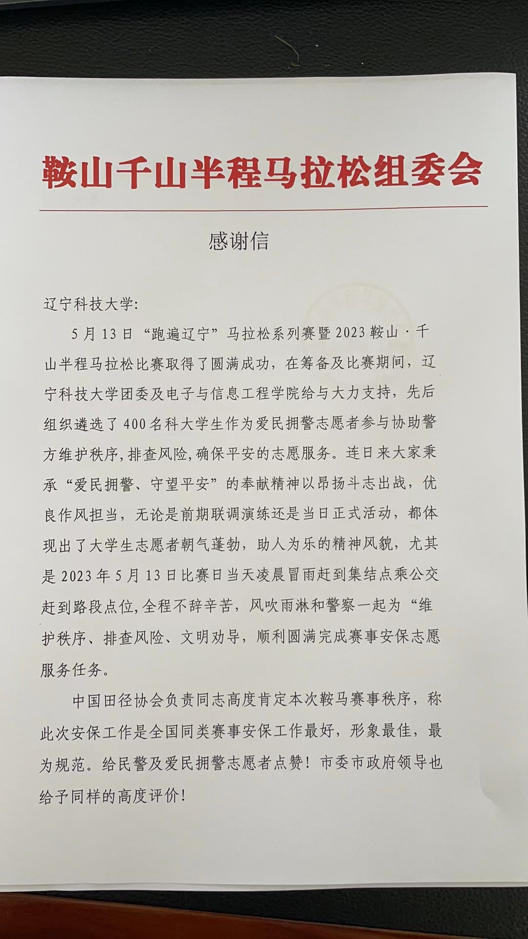 近日,遼寧科技大學收到來自鞍山千山半程馬拉松組委會的一封感謝信,由衷地感謝遼寧科技大學團委及電子與信息工程學院給予“鞍馬”賽事的大力支持,向遼科大400余名青年志愿者對此次馬拉松做出的卓越貢獻致以最真誠的謝意。