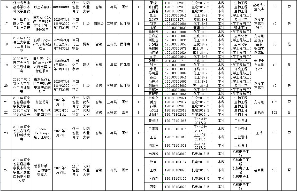 化工學院2020下半年學生創新創業競賽獲獎情況統計表