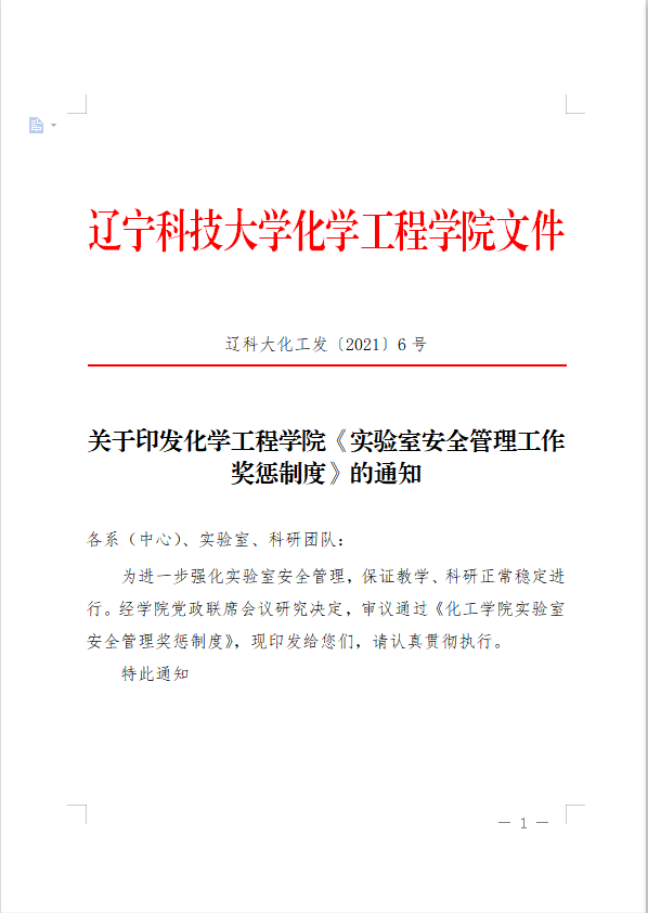 遼科大化工發〔2021〕6號 關于印發化學工程學院《化工學院實驗室安全管理獎懲制度》的通知.doc