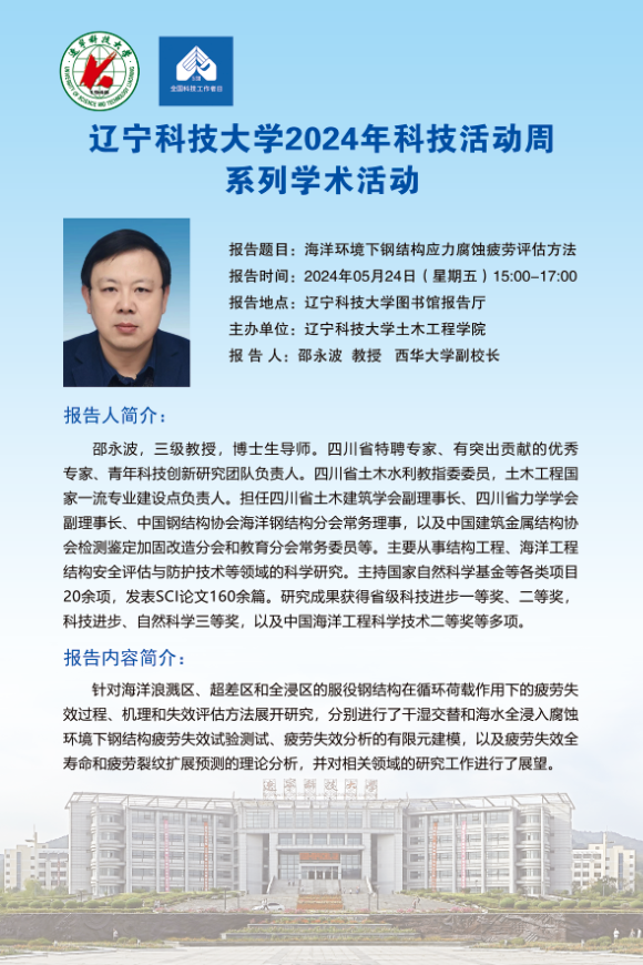 【科技活動周學(xué)術(shù)預(yù)告】海洋環(huán)境下鋼結(jié)構(gòu)應(yīng)力腐蝕疲勞評估方法