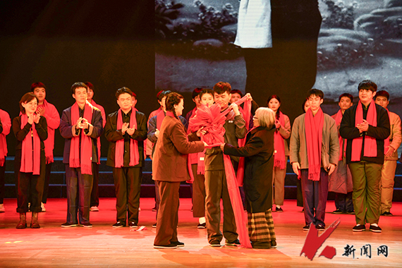 “雷鋒啊,雷鋒!我們離開家鄉(xiāng)湖南,來到祖國鋼都鞍山65年了。65年在歷史長河里,彈指一揮間……”劇目的開篇和尾聲,易秀珍老人上臺進行了特別出演。她親自朗讀懷念雷鋒的信——《來到祖國鋼都65年》,并與劇中的“易秀珍”扮演者,共同為去參軍的“雷鋒”戴上大紅花。易秀珍緩步登場前,背景大屏上展示著雷鋒在鞍鋼的插畫圖片,老人仿佛就這樣從歷史中走到觀眾眼前。這感人的一幕不僅讓臺下觀眾淚濕眼眶,也讓易秀珍激動不已。