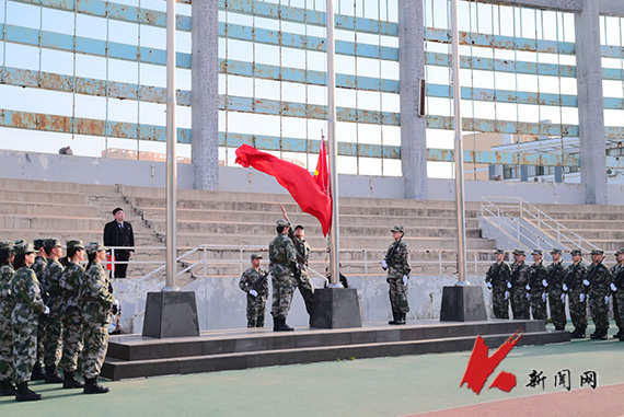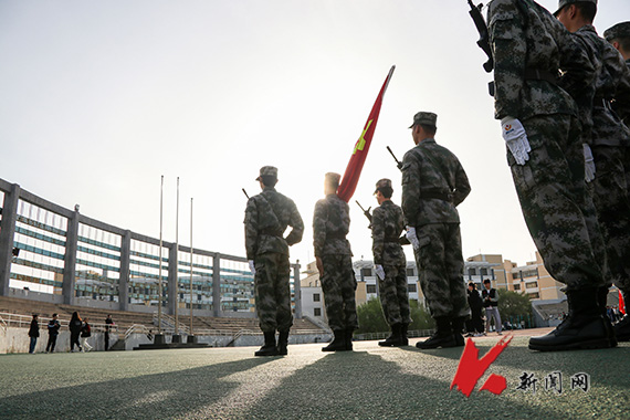 早上6點30分,升旗儀式正式開始。國旗護衛隊身著整齊的服裝,迎著朝陽,昂首闊步,護送著五星紅旗,邁向升旗臺。伴著國歌,五星紅旗冉冉升起,在晨曦中迎風飄揚。全體人員肅立,唱國歌,面向國旗行注目禮。