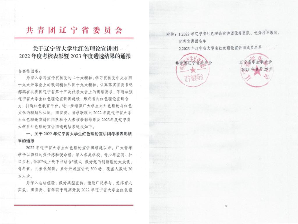 近日,共青團遼寧省委員會、遼寧省學生聯合會聯合通報2022年遼寧省大學生紅色理論宣講團考核表彰結果,遼寧科技大學“鋼花”新時代大學生理論宣講團獲評2022年遼寧省大學生紅色理論宣講團優(yōu)秀團隊。宣講團負責人劉梓聰獲評“優(yōu)秀宣講員”榮譽稱號。