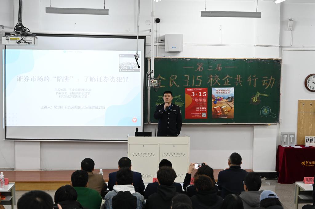 活動伊始,東方財富證券鞍山南勝利路營業(yè)部總經(jīng)理吳超發(fā)表講話,強調(diào)了本次活動對學(xué)生金融知識教育和風險防范意識培養(yǎng)的重要性,肯定了校企合作在金融知識普及方面的積極意義。在宣講環(huán)節(jié),來自中國人民銀行鞍山市分行、鞍山市公安局經(jīng)偵支隊的專家、東方財富證券的工作人員以及經(jīng)法學(xué)院的學(xué)生代表帶來了豐富且實用的內(nèi)容。從反洗錢、反詐防騙、反假幣知識,到資本市場刑事犯罪風險、非法薦股陷阱剖析,通過實際案例分析,為同學(xué)們敲響金融安全警鐘。互動提問環(huán)節(jié),同學(xué)們踴躍發(fā)言,就關(guān)心的金融熱點和風險防范問題與嘉賓交流。東方財富證券鞍山南勝利路營業(yè)部為參與互動的同學(xué)們贈送了精美紀念品。