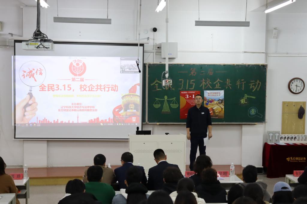 3月14日,經(jīng)法學(xué)院攜手東方財富證券鞍山營業(yè)部在博學(xué)樓C102開展第二屆“全民3.15,校企共行動”主題活動。東方財富證券鞍山南勝利路營業(yè)部及中國人民銀行鞍山市分行、鞍山市公安局經(jīng)偵支隊金融大隊一行15人、經(jīng)法學(xué)院黨政領(lǐng)導(dǎo)及輔導(dǎo)員7人出席活動,學(xué)院近270名學(xué)生參加了本次活動。