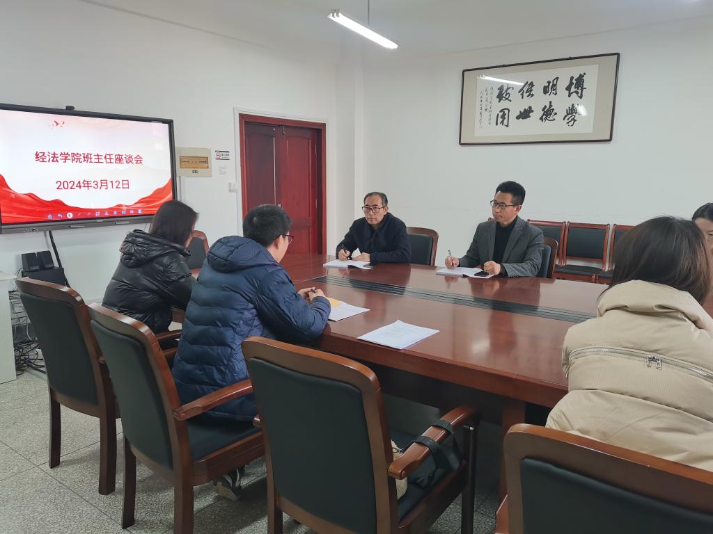 3月12日,經法學院于博識樓A315召開2023級班主任座談會議,會議由學院黨委副書記張國華主持,學院黨委書記趙智博、學辦主任齊艷萍以及李俊等7位2023級班主任參加了會議。