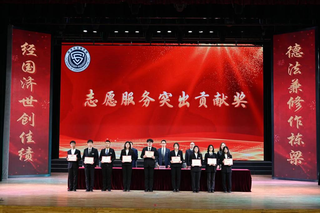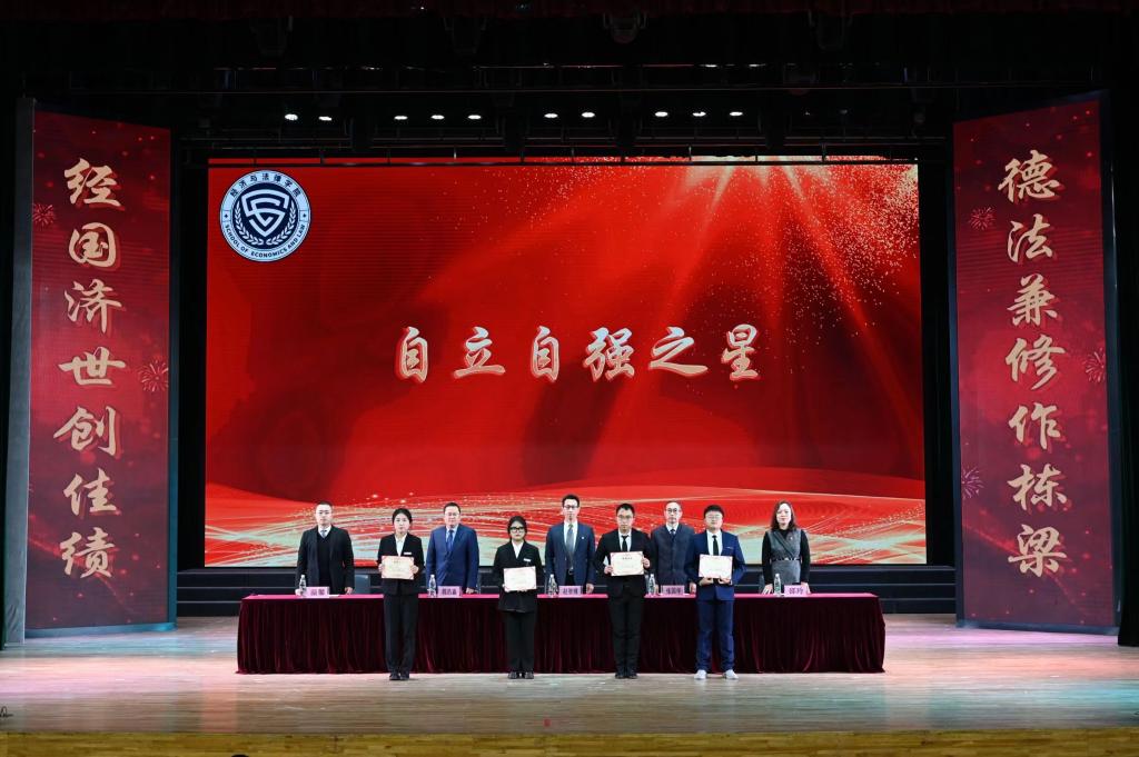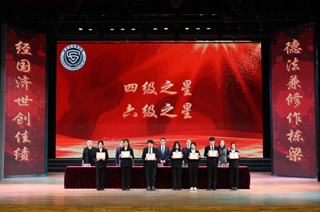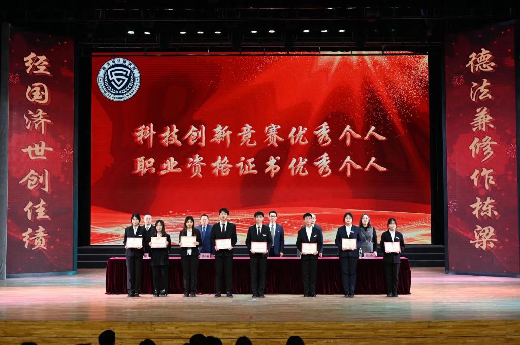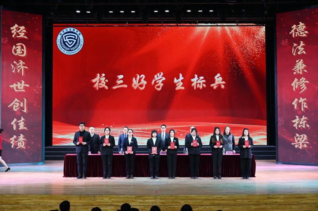 在經法學院副院長溫馨宣讀評優表獎名單后,與會領導為獲得榮譽的36個優秀集體和113個優秀個人頒發榮譽證書并合影留念。每一位獲獎成員臉上都洋溢著自豪的笑容,觀眾席上掌聲陣陣,現場氣氛熱烈。學生骨干突出貢獻獎獲得者吳雨純作為學生代表發言,她向悉心教導學生的學院領導和老師們表達了真摯的感謝,并鼓勵同學們以嚴謹務實的求學態度、科學高效的學習方法刻苦鉆研,力爭上游;同時注重理論和實踐相結合,提高綜合素質,實現全面發展。