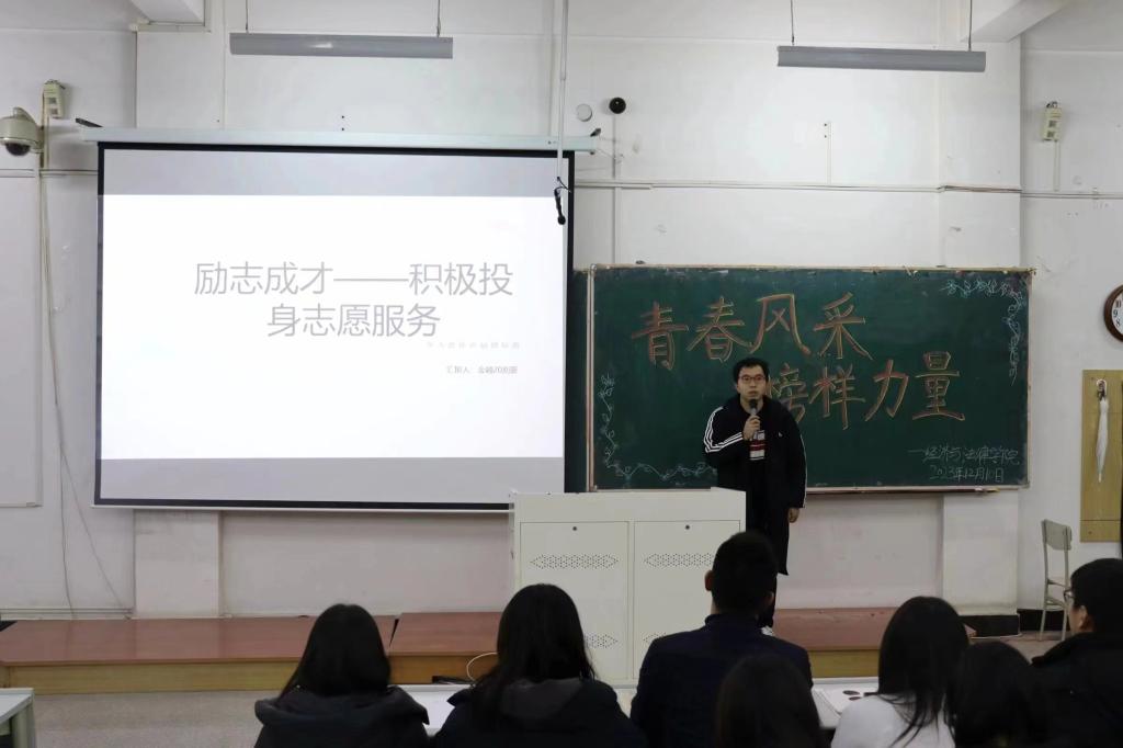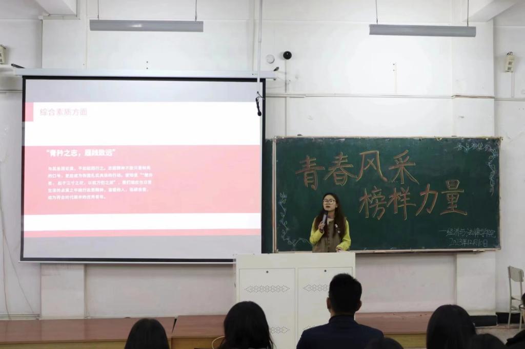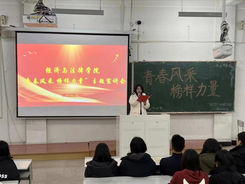 12月10日,經(jīng)法學(xué)院于博學(xué)樓C102開展“青春風(fēng)采 榜樣力量”主題宣講會。學(xué)院優(yōu)秀學(xué)生代表2023年鋼鐵標(biāo)兵年度人物代郁璇、十佳大學(xué)生張詩晗琪、道德楷模劉豪、十大學(xué)習(xí)標(biāo)兵于瀾受邀擔(dān)任宣講人,經(jīng)法學(xué)院黨委書記趙智博以及團學(xué)骨干出席會議,學(xué)院2022級、2023級350名本科生參加會議。
