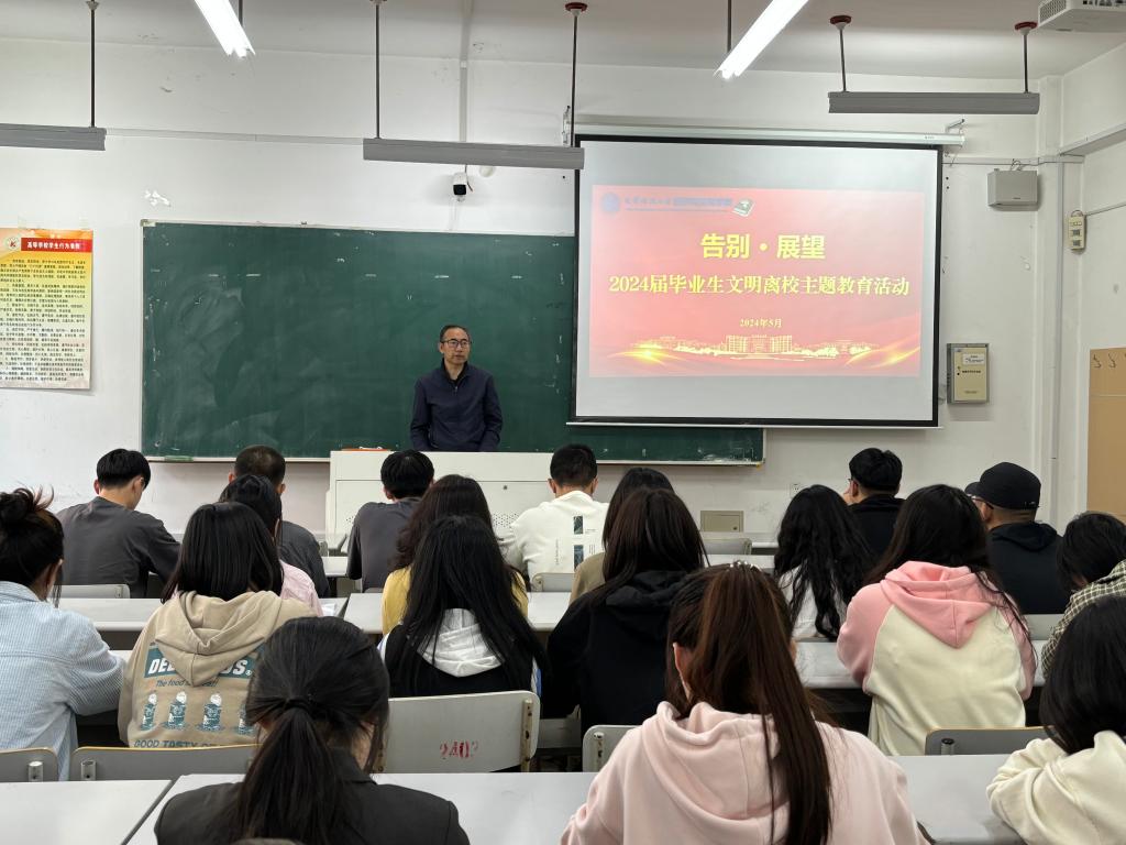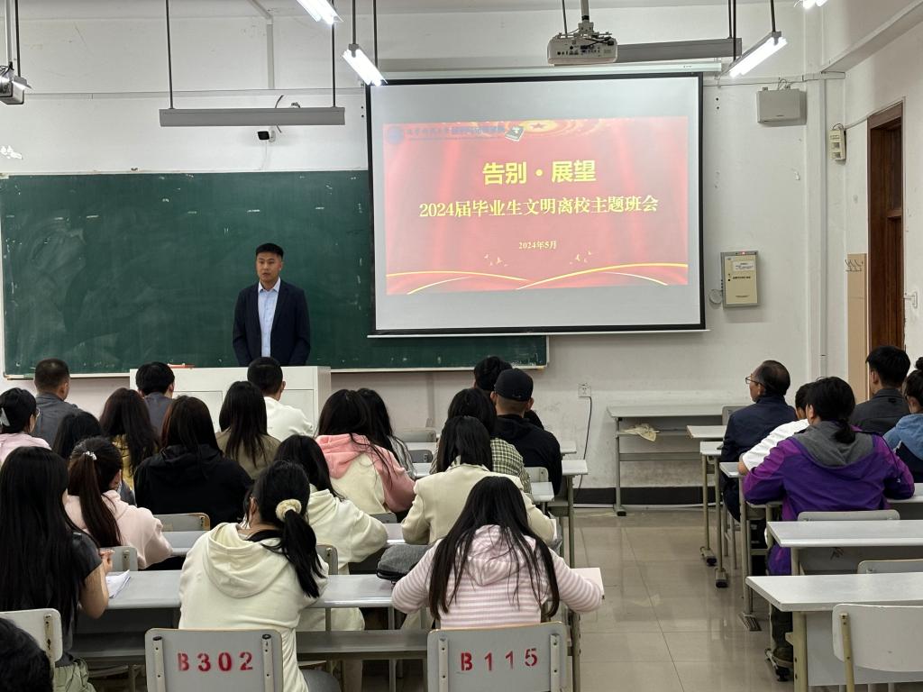 班會伊始,學院2024屆畢業班輔導員張鵬飛回顧了同學們在校期間的成長變化,肯定了他們勤奮好學、積極進取的學習和生活狀態,并就畢業生考研、就業等未來發展問題進行了交流和解答。他表示,希望畢業生們在未來的工作和生活中能夠繼續發揚昂揚向上的精神,熱愛母校,以校為榮,為社會做出更大的貢獻。張鵬飛強調了文明離校的重要性,并通過講解相關政策和規定,引導畢業生們以文明、有序的方式告別母校。他詳細闡述了保持宿舍衛生、愛護公共設施、遵守交通規則等方面的具體要求,表示希望畢業生們能夠以身作則,為學弟學妹們樹立良好的榜樣。隨后,張國華作總結發言。他向即將離校的畢業生們表達了深深的祝福和美好的期望,并強調,文明離校不僅僅是一種形式,更是一種責任和擔當,希望畢業生們能夠以實際行動踐行文明離校的理念,將母校的美好傳統和精神風貌傳承下去。張國華鼓勵畢業生們時刻保持感恩之心,感謝母校的培養和關懷,感謝老師們的辛勤付出和教誨,同時在未來的工作和生活中注重自我提升和成長,不斷學習和進步,勇于創新和突破,努力實現自己的人生價值。最后,班會在一片溫馨、和諧的氣氛中圓滿結束。畢業生們紛紛表示,在此次班會中感受到了母校的溫暖和關懷,通過班會更加堅定了對未來的信心,收獲了繼續努力拼搏奮斗的動力,并表示未來將以更加飽滿的熱情和更加堅定的步伐邁向新的人生階段,為實現自己的夢想而努力奮斗。