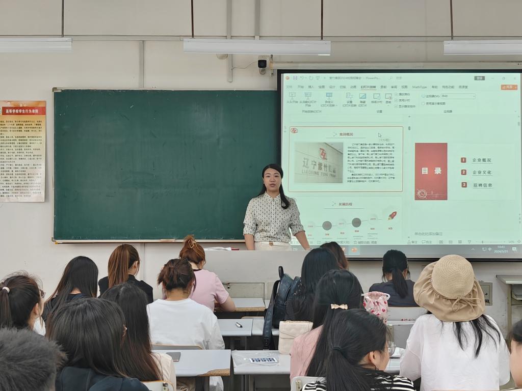 會議伊始,張鵬飛老師首先對遼寧紫竹集團的到來表示歡迎,并希望同學們能夠把握本次機會,找到一份令自己滿意的工作。隨后,遼寧紫竹集團人力資源部王瑩瑩圍繞企業概況、企業文化、招聘信息三方面進行宣講。通過工作場景照片的展示,同學們深刻感受到了該企業嚴謹的工作作風和“自強不息,產業報國”的企業精神,而企業成員們的團建合照則是生動詮釋了“溫度職場”,使同學們感受到了良好的工作環境和團結向上的工作氛圍。最后,王瑩瑩圍繞招聘要求、薪資福利、招聘渠道等為同學們進行詳細講解,表示該企業十分重視人才培訓和培養計劃,歡迎同學們懷揣著一份夢想加入紫竹集團,與之攜手進步、共創未來!