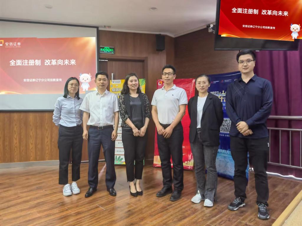 安信證券公司遼寧分公司投顧中心負責人、資深投顧魏澤文為同學們播放了企業宣傳片,并結合安信證券公司的股東背景、金融服務平臺、營銷服務網絡、研究團隊以及投行業務等方面對公司的基本概況做了介紹。隨后,魏澤文圍繞股票發行全面注冊制新變化展開宣講,從注冊制的定義和非法證券期貨活動形式等方面進行講解,使同學們對股票發行全面注冊制新變化的意義、規則及風險有了比較深入的了解。他還鼓勵同學們要提高風險意識,謹防非法證券期貨騙局。他希望同學們積極參加投資者權益知識競賽,努力提升自己,同時非常歡迎有同學們到安信證券實習或就業。