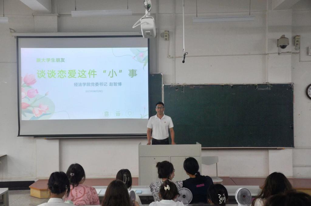 6月29日,經法學院黨委書記趙智博于博學樓A101以“談談戀愛這件‘小’事”為題開展專題講座,學院黨委副書記張國華出席,2022級全體學生聽取了講座。