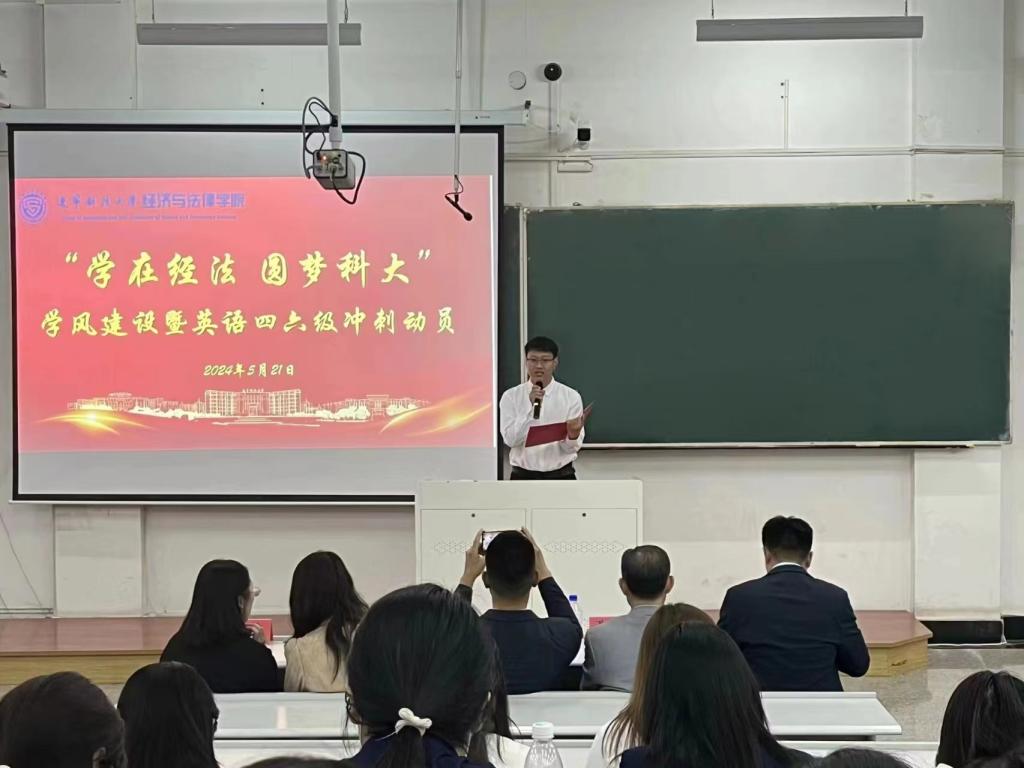 5月21日,經(jīng)法學院于博學樓C102召開“學在經(jīng)法,圓夢科大”學風建設暨英語四六級考試動員大會,學院黨委書記趙智博、黨委副書記張國華、學辦主任齊艷萍、團委副書記張鵬飛、金融系主任崔鵬、金融科技系主任郭威、國貿(mào)23-2班班主任李俊、金融科技23-2班班主任劉擎、金融23-2班班主任秦子璇出席會議,學院各年級近350名學生參加了會議。