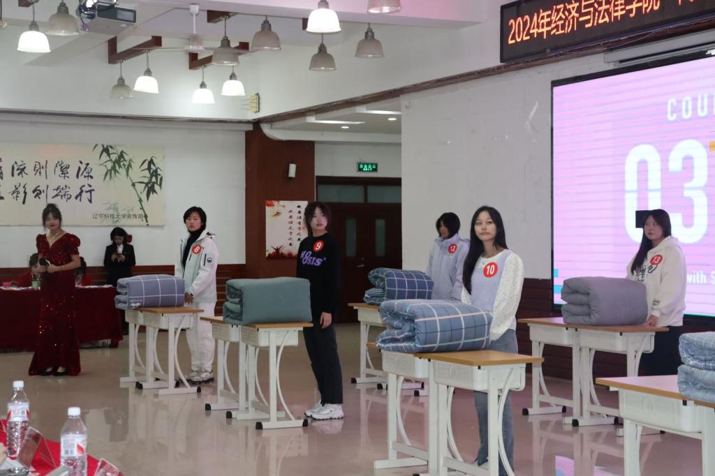 活動中,學院學生會文藝團劉舒揚帶來的開場舞表演,為活動拉開了絢麗的序幕。本次寢室文化節設有“寢室Vlog大賽”“寢室才藝大賽”和“疊被子大賽”三大精彩單元。在熱烈的掌聲中,“寢室Vlog大賽”率先展開,在寢室成員的現場介紹下參賽寢室精心制作的視頻作品一一展出,這些作品生動地捕捉了寢室生活中的歡聲笑語、學習瞬間以及宿舍內務的點滴,深刻體現了室友間的深厚情誼和充滿活力的寢室文化;在“寢室才藝大賽”環節上,選手們紛紛大顯身手,為觀眾呈現了一場精彩絕倫的視聽盛宴。詩朗誦《我喜歡你》情感真摯、意境優美,令觀眾深深陶醉,參賽作品《家有兒女》以及《稻香》等歌曲串燒,充分展現了經法學子的才藝與魅力,彰顯出宿舍作為大學生活核心單元的溫馨與活力,贏得了在場老師和同學們的陣陣掌聲。張芮銘的歌曲《飛奔向你》以及游戲環節中的一元五角游戲更是將活動氣氛推向了新的高潮。