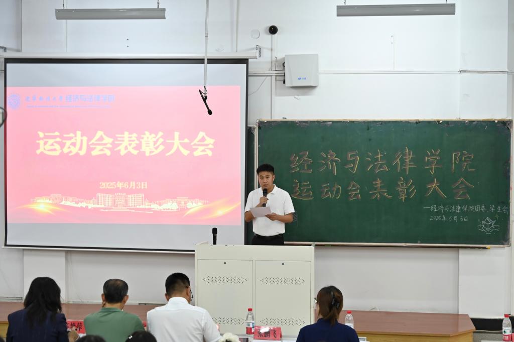 6月3日,經法學院于博學樓C102召開第五十三屆運動會表彰大會。會議由學院學生會主席團成員劉家輝主持,學院黨委書記趙智博、黨委副書記張國華、學辦主任齊艷萍、團委副書記張鵬飛出席會議,學院全體團學骨干及運動員近200人參加會議。