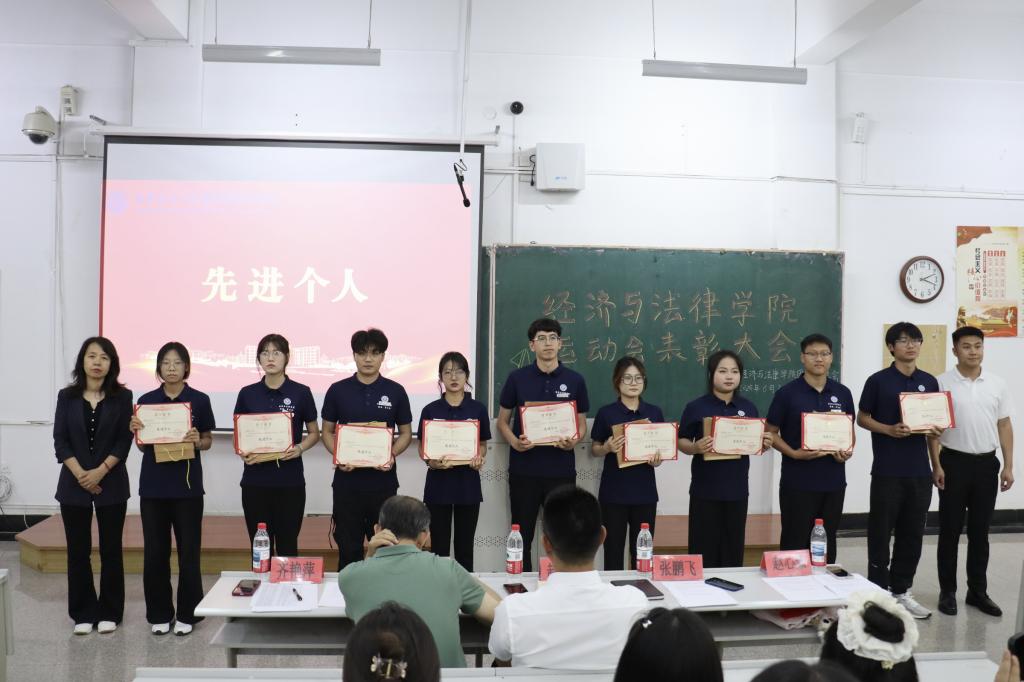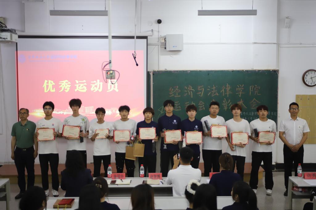 會議伊始,全體與會人員共同奏唱國歌。通過一段精心制作的視頻,大家共同回顧經法運動健兒在第五十三屆運動會中的卓越表現。隨后,團委副書記張鵬飛宣讀學院體育道德風尚獎、志愿服務突出貢獻獎、先進個人及優秀運動員的獲獎名單。團委學生副書記邱千純、劉帥家為5個班級頒發體育道德風尚獎;學生會執行主席趙心豪、體育部負責人李佳澳為12名優秀志愿者頒發榮譽證書;學辦主任齊艷萍、團委副書記張鵬飛為21名運動會工作人員授予先進個人獎;黨委書記趙智博、黨委副書記張國華為79名優秀運動員頒發榮譽證書。最后,獲獎學生與老師合影留念,掌聲雷動。
