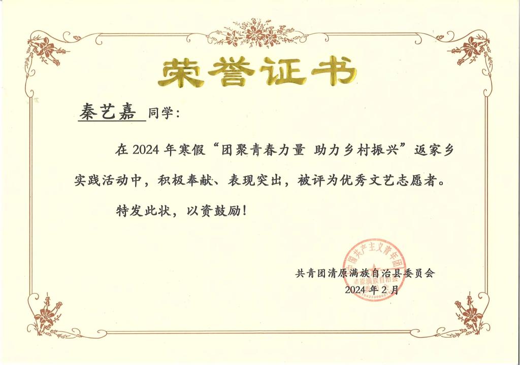 秦藝嘉,女,共青團(tuán)員,金融23-1班學(xué)生,現(xiàn)任校大學(xué)生自我管理委員會(huì)辦公室工作人員。2024年寒假期間,該生以青春之名、赴家鄉(xiāng)之約,在團(tuán)清原縣委辦公室開展為期一個(gè)半月的實(shí)踐活動(dòng)。