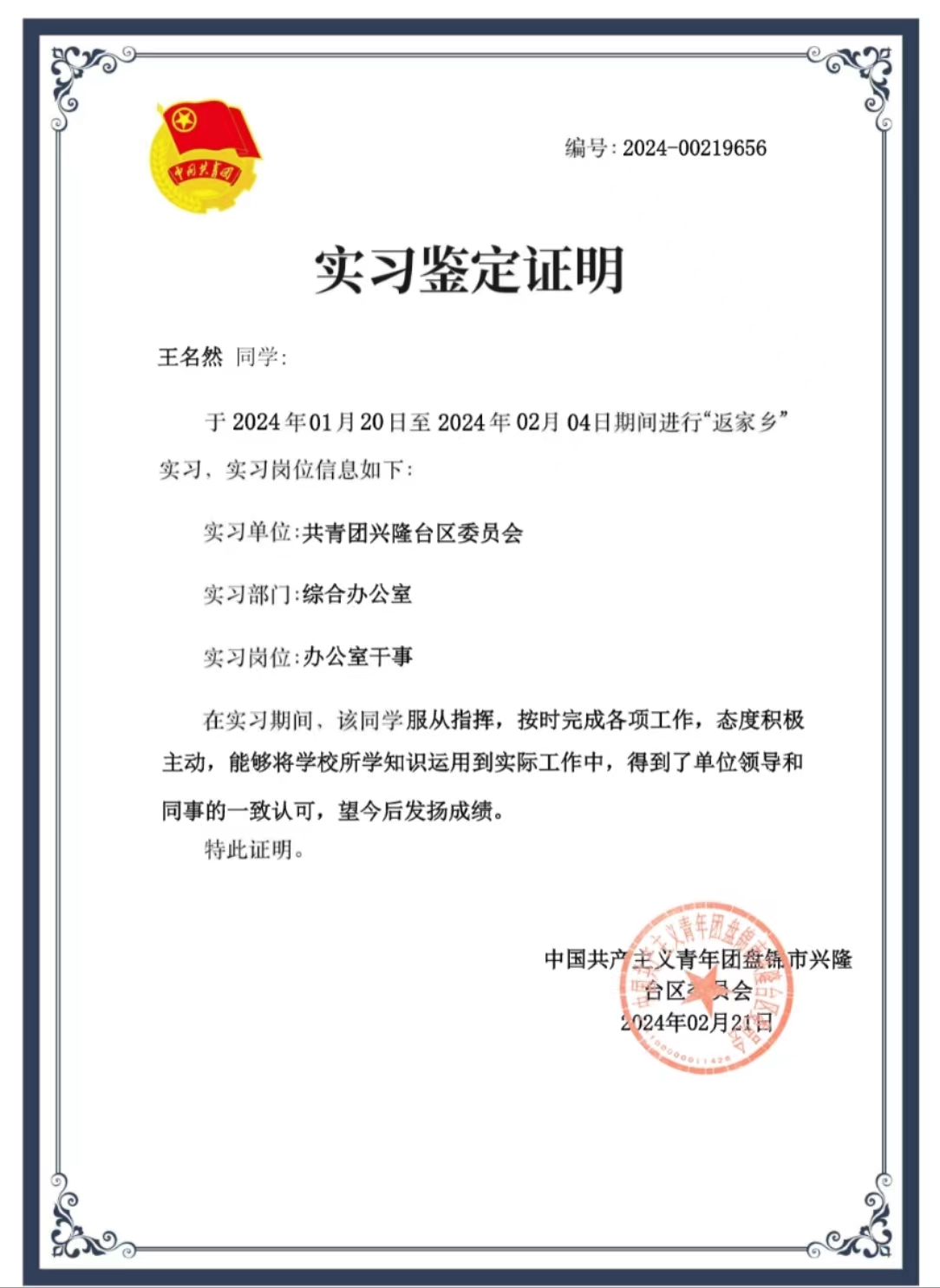 這次寒假的實(shí)踐之旅,是一場拓展人生的實(shí)踐之旅。作為一名“返家鄉(xiāng)”的大學(xué)生志愿者,有幸被興隆臺(tái)區(qū)團(tuán)委錄用,在綜合辦公室擔(dān)任干事一職,主要負(fù)責(zé)的工作是整理信息、活動(dòng)策劃、發(fā)布通知等工作,期間還參加了興隆臺(tái)區(qū)中小學(xué)冬季研學(xué)營的活動(dòng)全程,在活動(dòng)期間,我主要負(fù)責(zé)帶領(lǐng)中小學(xué)生在每一個(gè)研學(xué)地點(diǎn)進(jìn)行學(xué)習(xí)、策劃組織活動(dòng)以及知識(shí)宣講,我們本次活動(dòng)也被盤錦市廣播電視臺(tái)報(bào)道。在此過程中,通過在辦公室工作,我學(xué)會(huì)了熟練運(yùn)用辦公室軟件,也深深地體驗(yàn)了帶領(lǐng)團(tuán)隊(duì)一起完成任務(wù)的滿足感與幸福感,希望以后還能繼續(xù)參加“返家鄉(xiāng)”社會(huì)實(shí)踐活動(dòng),為家鄉(xiāng)發(fā)展貢獻(xiàn)出自己的一份力量!