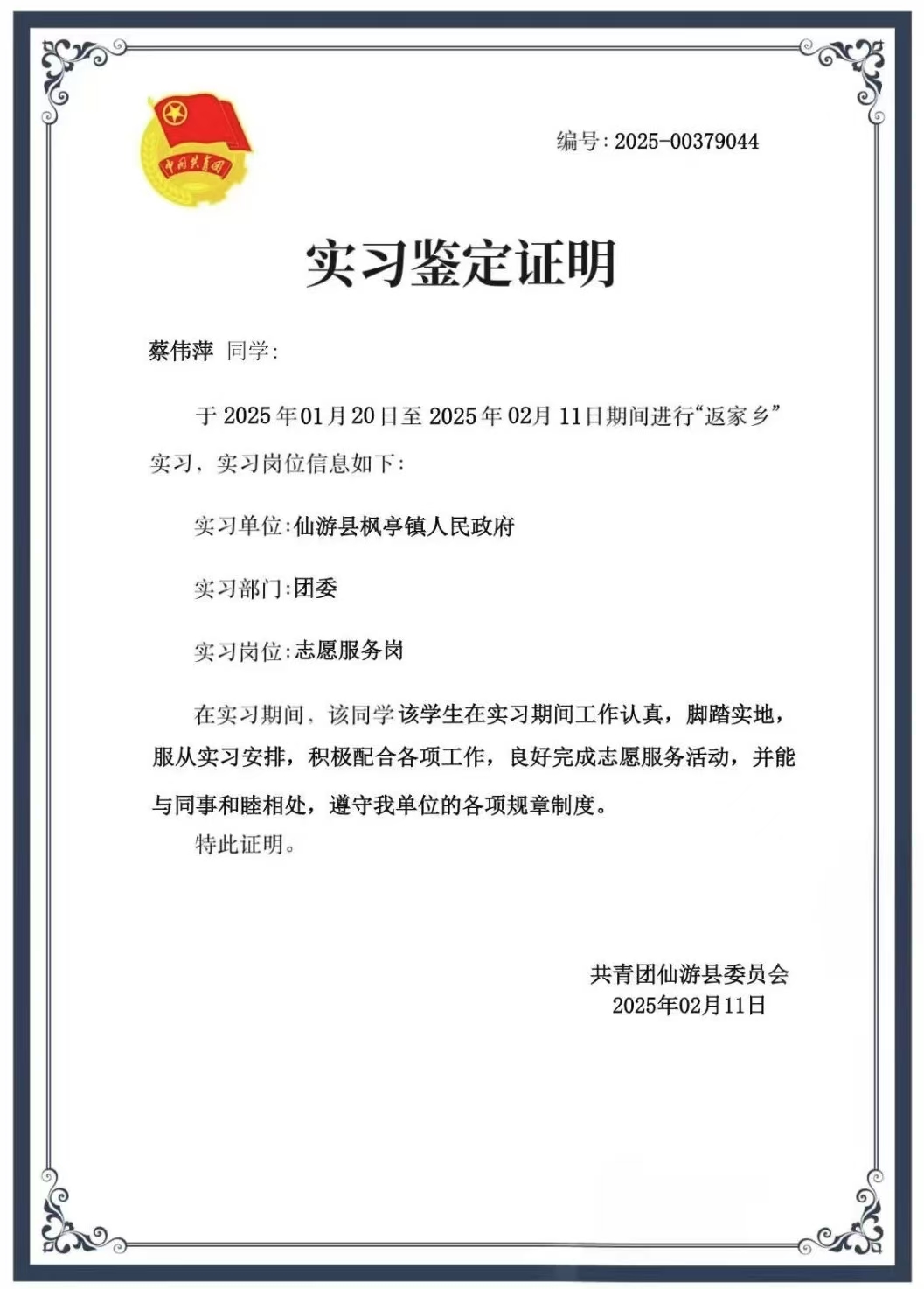 蔡偉萍,女,共青團員,法學24班學生,現任班級組織委員。寒假期間她積極投身“返家鄉”社會實踐活動,在仙游縣楓亭鎮人民政府進行了為期二十天的志愿服務。