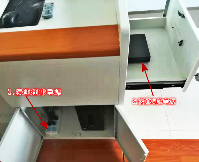 2、打開電腦機柜,開啟電源;打開機柜右側抽屜,開啟功放電源,功放的話筒音量、音響音量按鈕可根據需要適當調節;