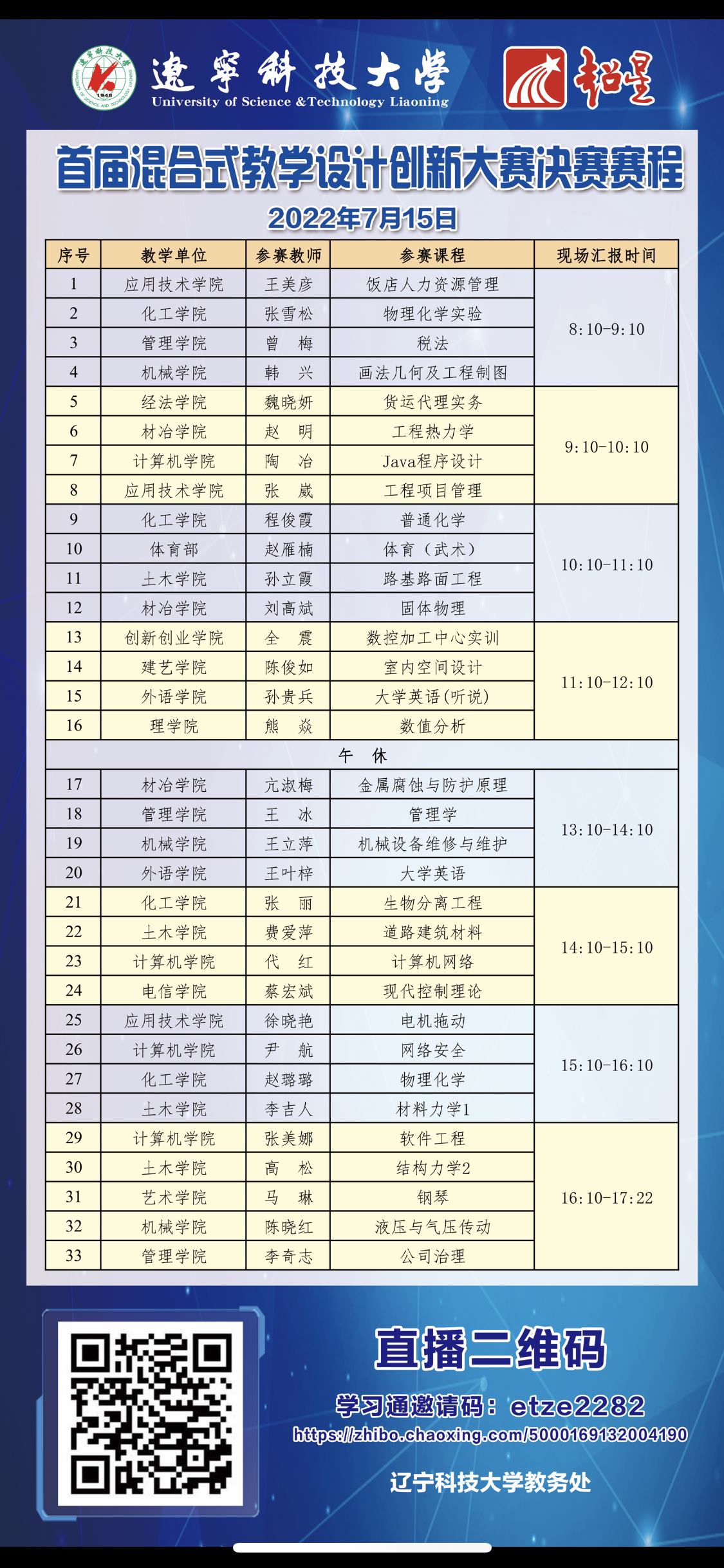 為深化信息技術(shù)與教育教學(xué)的融合,以混合式教學(xué)設(shè)計(jì)創(chuàng)新促進(jìn)教師信息化教學(xué)能力提升。根據(jù)《關(guān)于組織開展第四屆全國(guó)高校混合式教學(xué)設(shè)計(jì)創(chuàng)新大賽校賽的通知》(遼科大教發(fā)〔2022〕70號(hào))要求,現(xiàn)就大賽決賽相關(guān)事宜通知如下: