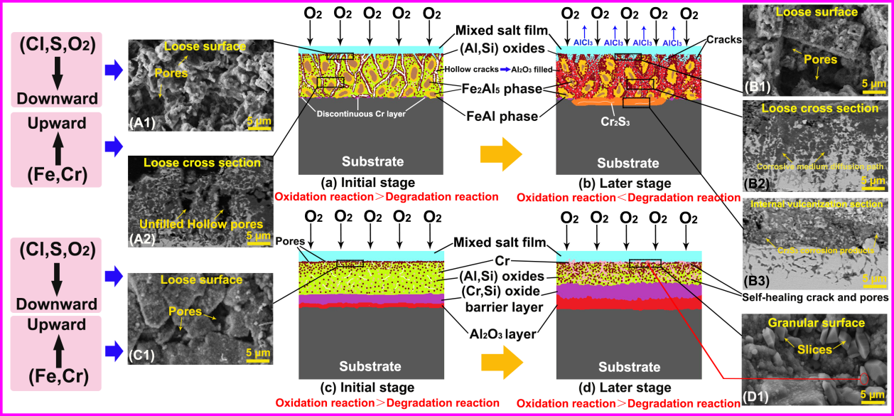 >> 1.機械表/界面摩擦效應與基礎理論 重點聚焦典型工程應用環境零部件材料表界面摩擦特性與損傷特征,尤其關注高溫、摩擦、化學/電化學腐蝕等多環境因素的協同交互作用,從微納米尺度揭示材料-環境交互作用過程中界面摩擦化學反應規律,建立典型環境材料摩擦磨損理論與失效模型,為零部件優化設計與表面防護奠定理論基礎。 圖1磨損-腐蝕強耦合作用過程材料損傷與破壞機理 圖2高溫環境Ti-Al-Si-C-N涂層的摩擦損傷與潤滑失效機理 >> 2.先進功能涂層材料設計與性能調控 開展新型功能防護涂層材料及潤滑減磨材料設計、制備與使役損傷行為研究,通過涂層表面成分設計及微納米結構調控實現其界面減阻、超疏水防結冰、抗磨減磨與防粘等表界面功能,通過涂層體系梯度化結構設計實現其抗高溫熱疲勞沖擊與高界面結合等應用性能突破,發展新型功能涂層材料的設計合成與性能調控理論。 圖3高溫合金熱端部件表面鍍鋁雙陶瓷熱障涂層的高溫防護與延壽機理 圖4 馬氏體不銹鋼表面AlSi合金涂層的高溫熱鹽腐蝕防護機理 >> 3.先進成形制造與高效連接技術 開展光學元件玻璃模壓與輥壓成型機理與關鍵技術研究,建立熱壓印成型過程界面粘著摩擦效應協同抑制、粘彈態玻璃高效填充、玻璃微納光學元件形性協同控制新方法。開展輕量化板材鎖鉚塑性連接和無鉚塑性連接工藝研究,創成高強度、高應變敏感性異種板材的塑性成形連接新機理和新方法。 圖5 微納光學元件熱壓印成型機理 >> 4.涂層材料服役壽命精準預測理論 考慮工程應用環境因素,依據極端服役環境下涂層材料的失效特征、失效方式與臨界參數條件等數據積累,構建多環境因素/多尺度損傷過程理論物理模型,同步模擬計算零部件或者涂層的損傷演化過程,并對比試驗研究結果修正數學模型,提出新型高性能零部件或防護涂層材料/結構一體化設計策略與壽命預測方法。 圖6 梯度納米結構涂層的多次度動態承載失效過程預測 |
