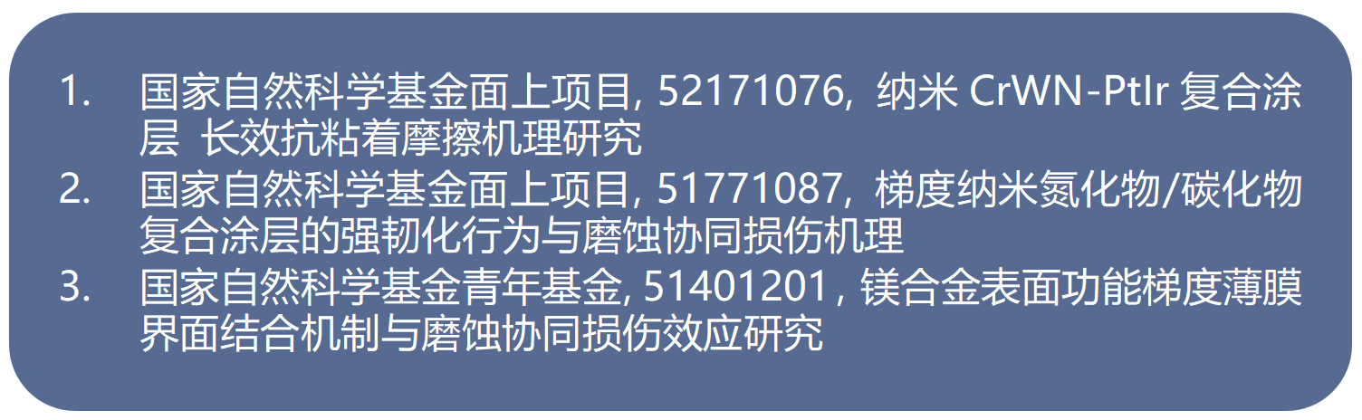 1. Effect of annealing environment on the microstructure and mechanical property of CrWN glass molding coating[J]. Surface & Coatings Technology, 2020 2. Understanding the wear failure mechanism of TiAlSiCN nanocomposite coating at evaluated temperatures[J]. Tribology International, 2021 3. Understanding the age-hardening mechanism of CrWN coating[J]. Thin Solid Films, 2020 |