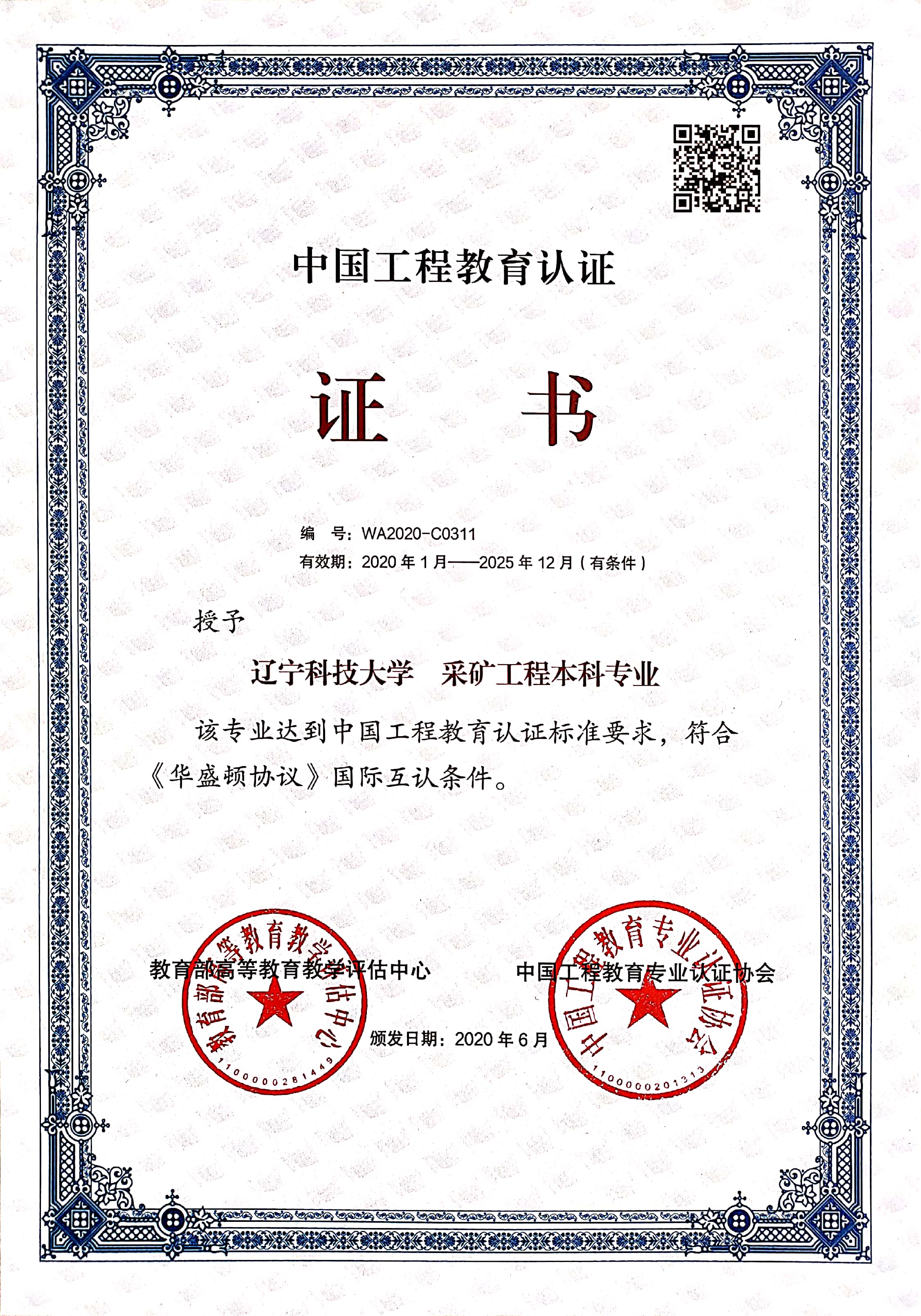 2020年采礦工程專業-中國工程教育認證證書
