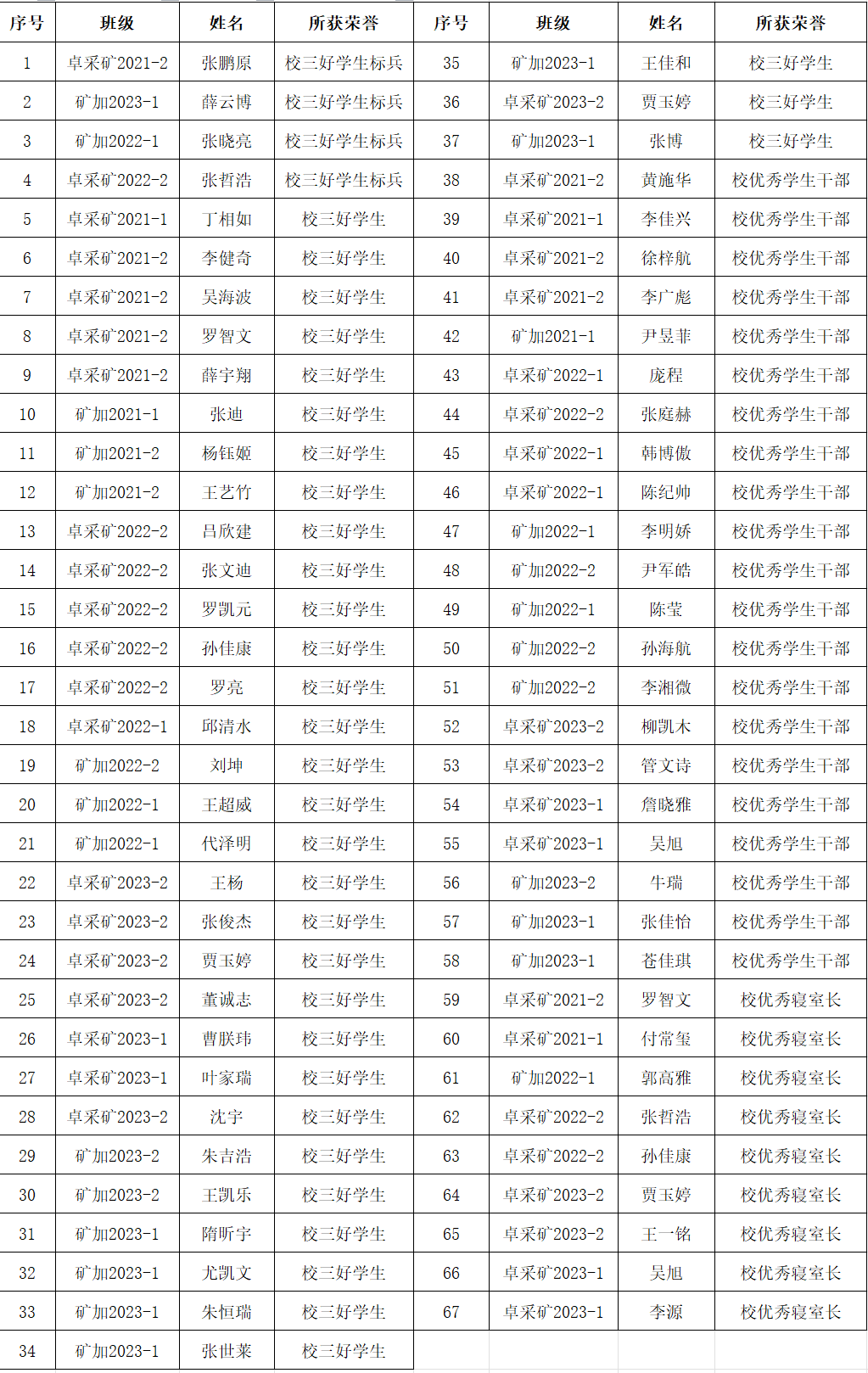 經個人申請,學院評優評審小組評選、審查,現對礦業學院2023-2024學年度校內評優獎項進行公示: