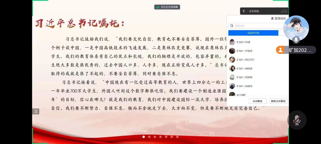 為深入貫徹落實習近平總書記重要講話精神,深切感悟新時代偉大成就,深入實施“時代新人鑄魂工程”、構建育人新生態,8月份期間,礦業工程學院于騰訊會議線上開展“習近平總書記與大學生在一起”主題系列宣講活動,本次宣講由院理論宣講團成員主講,礦業工程學院全體同學參加。