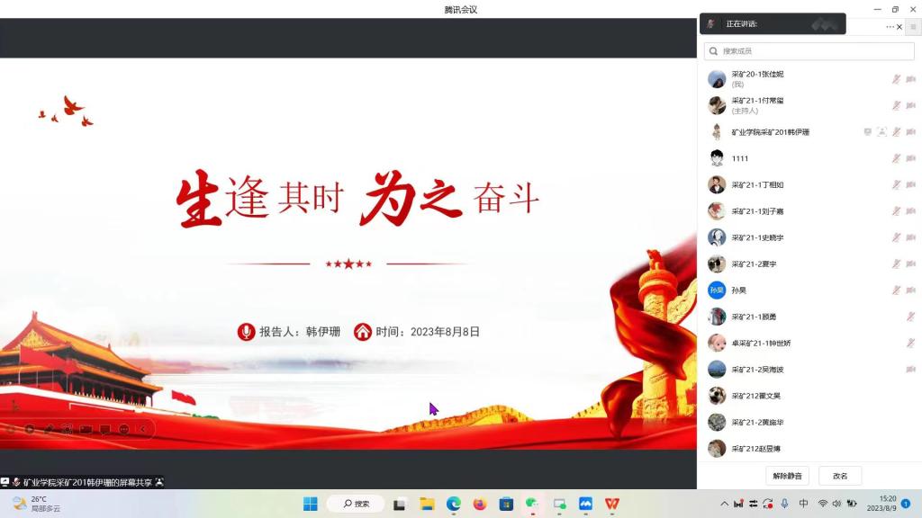 8月8日,宣講人——采礦20-1韓伊珊從生逢其時、奮斗之意義、成就奮斗人生三個部分向同學們闡述了習近平總書記的重要講話精神,她表示,生逢這個偉大的時代,同學們必須拿出責任擔當,要不負時代,不負韶華、不負黨和人民的殷切期望,無愧于肩負的青春責任,用踔厲奮發、不懈奮斗的昂揚姿態,凝聚中華民族的精神力量,展現中國青年的時代風采,為偉大時代的前行做出自己應有的貢獻。開啟中華復興的圓夢旅程。