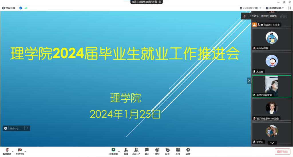 1月25日晚,理學(xué)院通過(guò)騰訊會(huì)議召開(kāi)“2024屆畢業(yè)生就業(yè)工作推進(jìn)會(huì)”,會(huì)議由高寶威老師主持,院黨委副書(shū)記侯立臣、團(tuán)委書(shū)記宋薇、校友代表及2024屆全體畢業(yè)生參加。