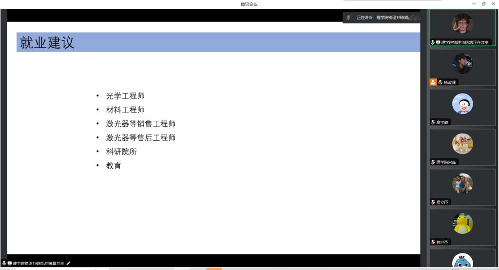 本次分享會邀請到就職于深圳先進(jìn)電子材料國際創(chuàng)新研究院的校友陳凱為同學(xué)們分享經(jīng)驗。在分享會上,陳凱校友從就業(yè)形勢和就業(yè)建議等兩個方面做交流介紹。在就業(yè)形勢上陳凱學(xué)長結(jié)合自身求職經(jīng)歷,認(rèn)為目前專業(yè)就業(yè)面廣闊,但是存在“雜而不精”的問題,導(dǎo)致就業(yè)相對薄弱。但是在專業(yè)交叉學(xué)科方面,他建議大家應(yīng)當(dāng)進(jìn)行進(jìn)一步的深造和提升。在就業(yè)建議上他推薦的領(lǐng)域有光學(xué)工程師、材料工程師、激光器售后服務(wù)師、科研院所和教育行業(yè)等方面。最后陳凱學(xué)長希望大家積極參加招聘會,豐富積累自己的經(jīng)驗,擴(kuò)展自己的眼界,充實自己的素質(zhì),并送給物理專業(yè)畢業(yè)生誠摯的祝福和期待。