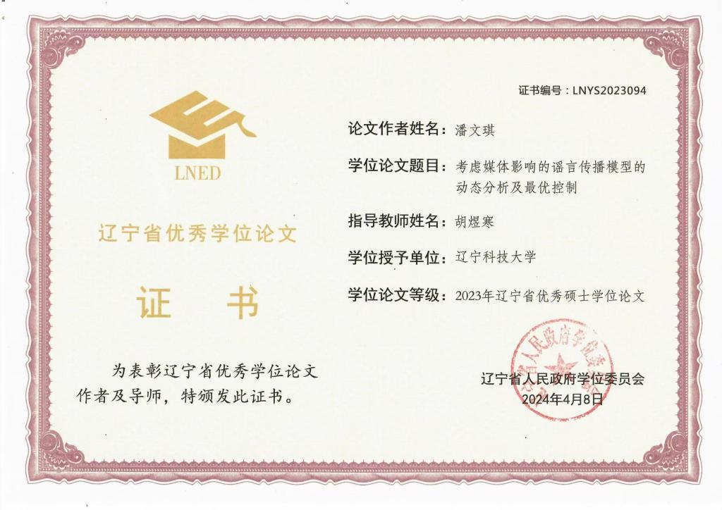 近日,遼寧省教育廳官網(wǎng)公布了2023年遼寧省優(yōu)秀碩士學位論文評選結(jié)果,其中理學院由胡煜寒副教授指導的碩士畢業(yè)生潘文琪所撰寫的論文《考慮媒體影響的謠言傳播模型的動態(tài)分析及最優(yōu)控制》,獲評優(yōu)秀碩士學位論文。這是繼劉昊教授指導的碩士生張旭偉獲評遼寧省優(yōu)秀碩士學位論文之后,理學院第二次獲此殊榮。