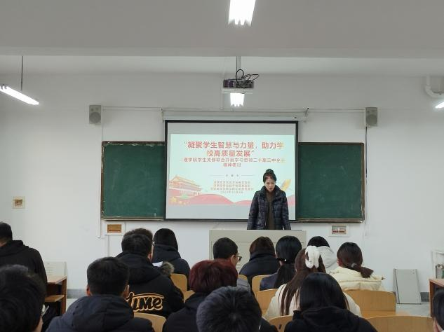 12月3日下午,理學院學生黨支部在明賢樓B402聯合召開“學習貫徹黨的二十屆三中全會精神”專題研討會,旨在為深入貫徹黨的二十屆三中全會精神,凝聚學生智慧與力量,推動學校高質量發展。會議由學生光學光電黨支部書記萬晴晴同志主持。