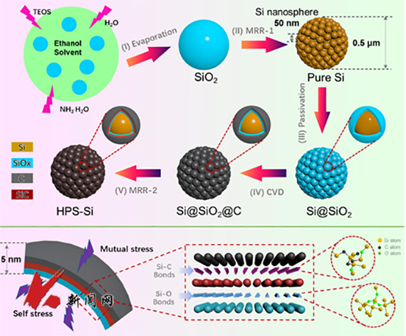 硅因其高理論容量被認(rèn)為是一種很有前途的鋰離子電池負(fù)極材料,然而硅在鋰化和脫鋰過(guò)程中產(chǎn)生的應(yīng)力會(huì)導(dǎo)致硅負(fù)極嚴(yán)重結(jié)構(gòu)損傷和不穩(wěn)定固態(tài)電解質(zhì)界面,嚴(yán)重阻礙了硅負(fù)極實(shí)際應(yīng)用。針對(duì)上述問(wèn)題,安百鋼教授團(tuán)隊(duì)和中科院金屬研究所李峰研究員合作,設(shè)計(jì)了一種具有多級(jí)石榴狀結(jié)構(gòu)的硅負(fù)極(HPS-Si),其由共價(jià)鍵聯(lián)接的亞納米級(jí)SiO2-x、SiC和C多相層修飾納米硅球自組裝的亞微米級(jí)硅構(gòu)成。這種多級(jí)石榴結(jié)構(gòu)硅負(fù)極HPS-Si能有效調(diào)節(jié)硅充放電過(guò)程的應(yīng)力變化以增強(qiáng)了負(fù)極電化學(xué)循環(huán)穩(wěn)定性能。相關(guān)成果“Hierarchical pomegranate-structure design enables stress management for volume release of Si anode”在線發(fā)表于《Journal of Materials Science & Technology》。DOI: 10.1016/j.jmst.2023.02.014。論文第一作者為化工學(xué)院2019級(jí)博士研究生狄方。(供稿單位:化工學(xué)院 圖片來(lái)源:化工學(xué)院)