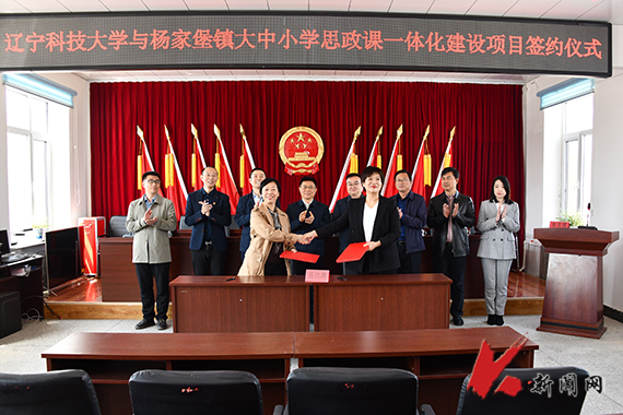 在楊家堡鎮調研期間,楊家堡鎮黨委書記王新宇、鎮長趙一澤對李平、孫曉華一行的到來表示熱烈歡迎,對遼寧科技大學一直以來的傾情幫扶表示衷心感謝。在“思政促發展 協同助振興”——遼寧科技大學與楊家堡鎮大中小學思政課一體化建設項目簽約儀式上,孫曉華與王新宇簽訂了項目合作協議。儀式結束后,李平、孫曉華一行在楊家堡鎮領導的陪同下,前往楊家堡中心學校為學校捐贈了體育用品,李平與王新宇共同為“遼寧科技大學體育美育實踐基地”揭牌。隨后一起旁聽了“大手牽小手 百梅獻給黨”——“美育浸潤行動”主題公開課。