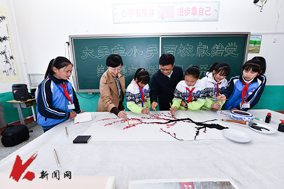 “風雨送春歸,飛雪迎春到。已是懸崖百丈冰,猶有花枝俏。俏也不爭春,只把春來報。待到山花爛漫時,她在叢中笑。”公開課在學生們的瑯瑯書聲中拉開序幕,我校建藝學院教師王東將朗誦毛澤東詩詞《卜算子·詠梅》作為切入點,帶領中心學校的學生們共同品悟中國傳統水墨畫中蘊含的中國傳統美學思想與人文精神,在教授梅花的畫法與技巧的同時,將中華傳統文化的意境之美、和諧之美、自然之美潛移默化地浸潤到學生心中,使學生們能夠學會享受繪畫這門藝術的同時,達到修身養性、陶冶情操的效用。作畫環節,校領導也紛紛拿起筆與學生們共同創作這幅百梅圖,在和諧、融洽的氣氛中結束了這堂生動的公開課。