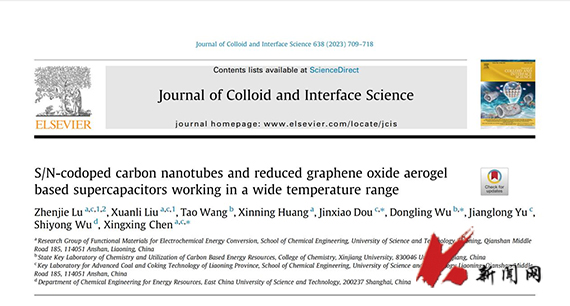 近日,遼寧科技大學化學工程學院“清潔能源與燃料化學”導學團隊依托先進煤焦化技術省重點實驗室,在非常溫超級電容器研究領域取得重要進展,研究成果在《Journal of Colloid and Interface Science》期刊上發表。論文題目為《S/N-codoped carbon nanotubes and reduced graphene oxide aerogel based supercapacitors working in a wide temperature range》。論文第一作者為2022屆碩士畢業生盧振杰,通訊作者分別為“清潔能源與燃料化學”導學團隊的竇金孝副教授、陳星星教授以及新疆大學吳冬玲教授,遼科大為第一通訊單位。