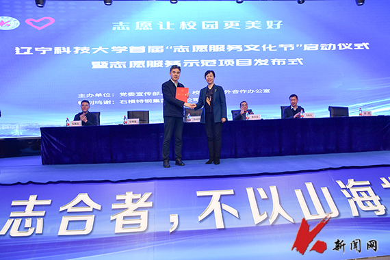 在啟動儀式上,遼科大校團委書記禹哲介紹了遼寧科技大學首屆“志愿服務文化節”總體情況;安增超為學校志愿服務專項基金捐款,遼科大財務處處長馮振權代表學校教育發展基金會接受捐贈;孫曉華為捐贈單位頒發捐贈證書。孫曉華、張佳亮、石橫特鋼集團領導以及大學生志愿者將代表“奉獻、友愛、互助、進步”志愿精神的綠葉和“心手標”插在“志愿樹”上,共同啟動學校首屆“志愿服務文化節”。