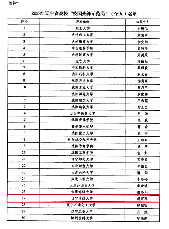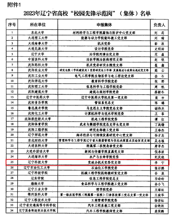 近日,2023年遼寧省高校“校園先鋒示范崗”名單公布,遼寧科技大學(xué)黨政辦機(jī)關(guān)黨委黨支部獲評(píng)2023年遼寧省高校“校園先鋒示范崗”(集體),理學(xué)院教工數(shù)學(xué)系黨支部書記胡煜寒獲評(píng)2023年遼寧省高校“校園先鋒示范崗”(個(gè)人)。全省高校共有50個(gè)基層黨組織和50名黨員入選。