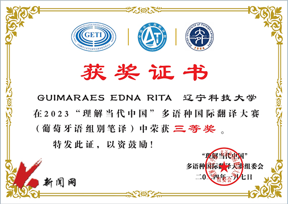 近日,由全國翻譯專業(yè)學(xué)位研究生教育指導(dǎo)委員會、中國翻譯協(xié)會對外傳播翻譯委員會、中國外文局翻譯院、遼寧省教育廳指導(dǎo),大連外國語大學(xué)主辦,大連外國語大學(xué)高級翻譯學(xué)院、多語種翻譯研究中心承辦的2023“理解當(dāng)代中國”多語種國際翻譯大賽獲獎結(jié)果公布。遼寧科技大學(xué)來華留學(xué)生GUIMARAES EDNA RITA(安哥拉籍)榮獲三等獎。