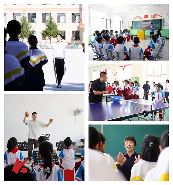 儀式后,遼科大隨行的教師團隊為桑林鎮中心學校的學生們帶來了一場別開生面的“浸潤體驗”。藝術學院院長李囝、體育部副主任曲博等教師和參加活動的遼科大學生,分別帶領桑林鎮中心學校中學部、小學部5個班級,以及社團100余名學生代表進行了“體育美育浸潤”主題教學示范公開課與活動指導,通過乒乓球、啦啦操、聲樂、播音、曲藝等體育和藝術形式,將愛國主義教育、團隊協作與創新能力培養融入體育運動和美育活動中,幫助學生們在競技、表演的同時收獲成長和快樂。一時間,操場上、課堂中歡聲笑語,學生們積極參與,努力為團隊增光添彩,每一次“活動展示”都得到了現場師生的熱烈掌聲。