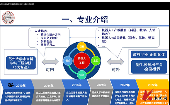 交流會上,陳國棟從機器人工程專業培養方案的主線與專業方向界定,機器人工程課程體系構建,機器人專業人才培養方向的確定與實施,數字化設計與數字孿生技術的課程邊界與內容組合,教學條件建設規劃,實驗實習實訓體系建設規劃,以賽代課、以賽促學的實踐和經驗,師資隊伍與能力建設七個方面詳細介紹了蘇州大學機器人工程專業課程構建情況。對數字化設計與數字孿生技術的課程設置與分布進行了重點講解。